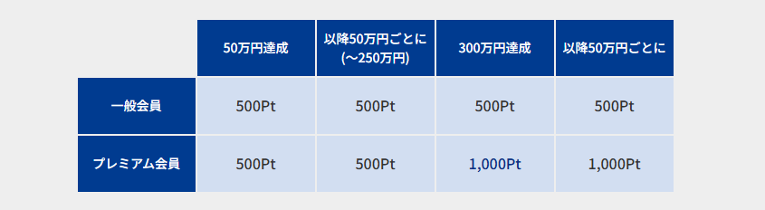 また、条件を達成し、カードの決済額にてゲットできるマイルが異なります。