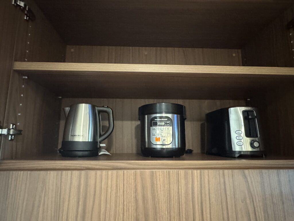 実際に炊飯器でご飯を炊いて、テイクアウトしたポケやガーリックシュリンプと部屋で食べましたが、こういう使い方が自然にできるのがこのホテルの強みです。